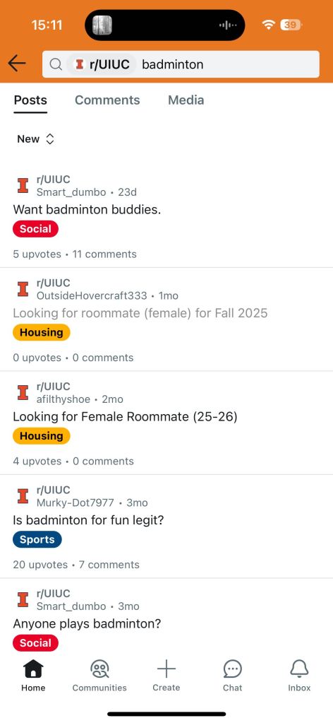 - Housing: Surprisingly, posts about finding roommates, where the author mentions “badminton” as a personal hobby.